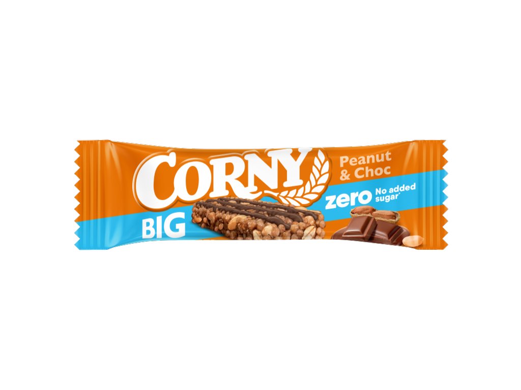 Corny BIG ZERO is a muesli bar with peanuts and milk chocolate that contains no added sugar. Its sweet taste is provided by sweeteners. It consists of 37% whole grains and is made completely without dyes and preservatives. (It contains only naturally occurring sugars).