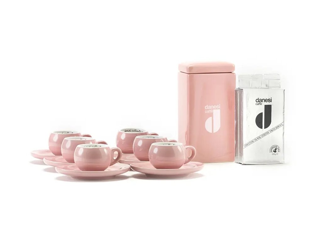 Danesi La Forma Gift Pack - Dark's Cassette Kava 250g + 6 espresso cups and 6 saucers - pink