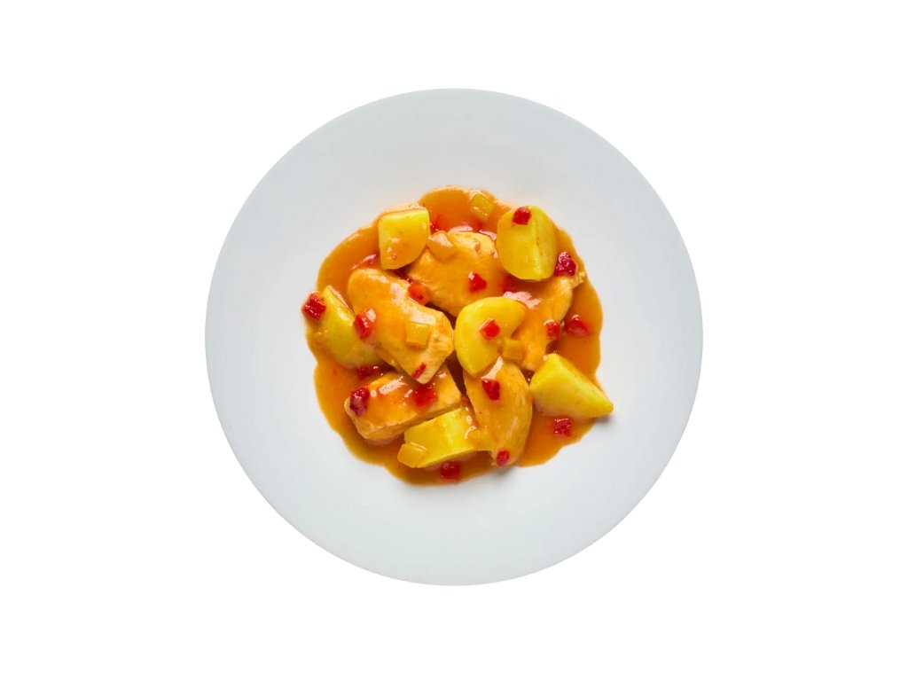 Ingredients: Meat 44.5%: chicken 98.3%, iodized salt; sauce 33.3%: tomatoes 33%, yellow pepper 21.8%, red pepper 21.8%, sunflower oil, potato starch, onion, garlic, iodized salt, sugar, chili peppers; potatoes 22.2%. May contain MILK , EGGS , FISH , CRUSTACEANS , MILK , NUTS , NUTS , ALMONDS , PARSLEY , SOYBEAN , CELERY , SENTIMENT , SULPHITES .