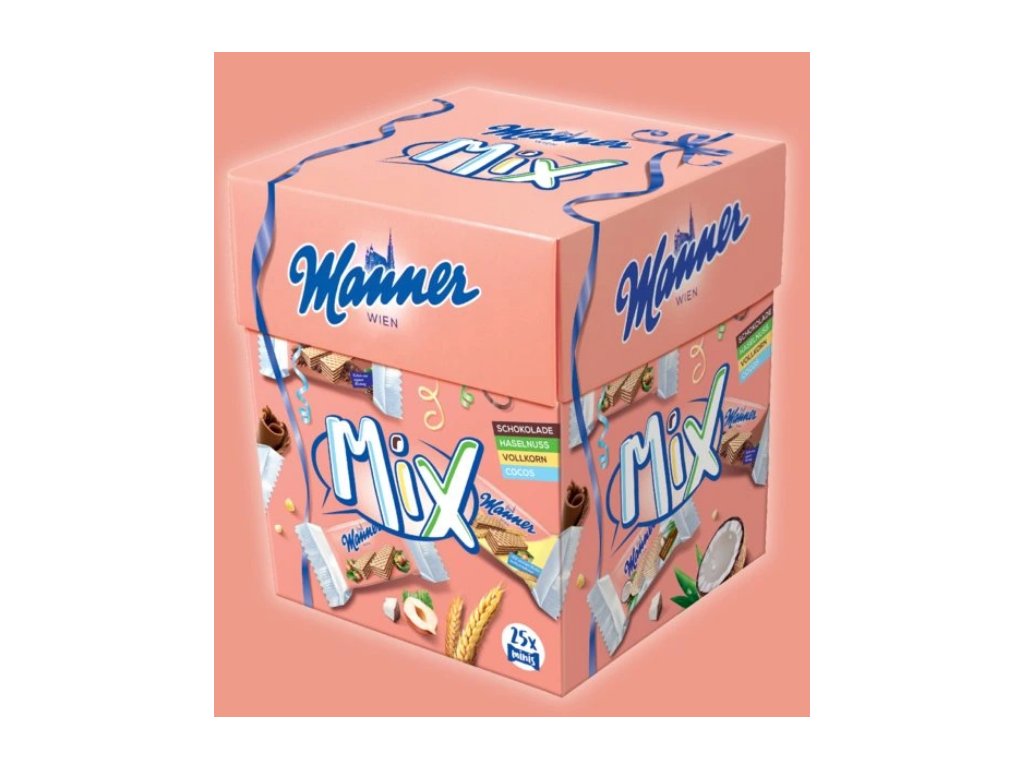 Wafers Mini Mix Wafers to beat your sweet tooth in a new package suitable for parties. The package contains several different flavors of individually wrapped wafers. Always and everywhere available, in practical packaging and of consistently high quality, the popular "Manner wafers" have accompanied people in all life situations for several generations. Let yourself be seduced and experience a piece of history!