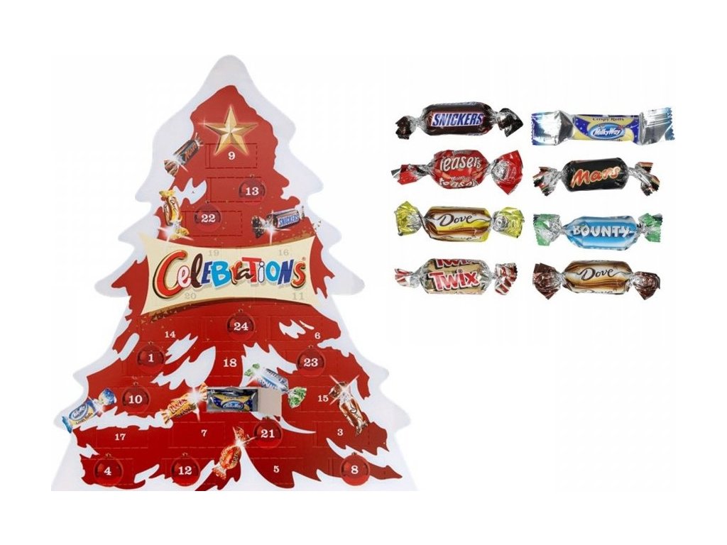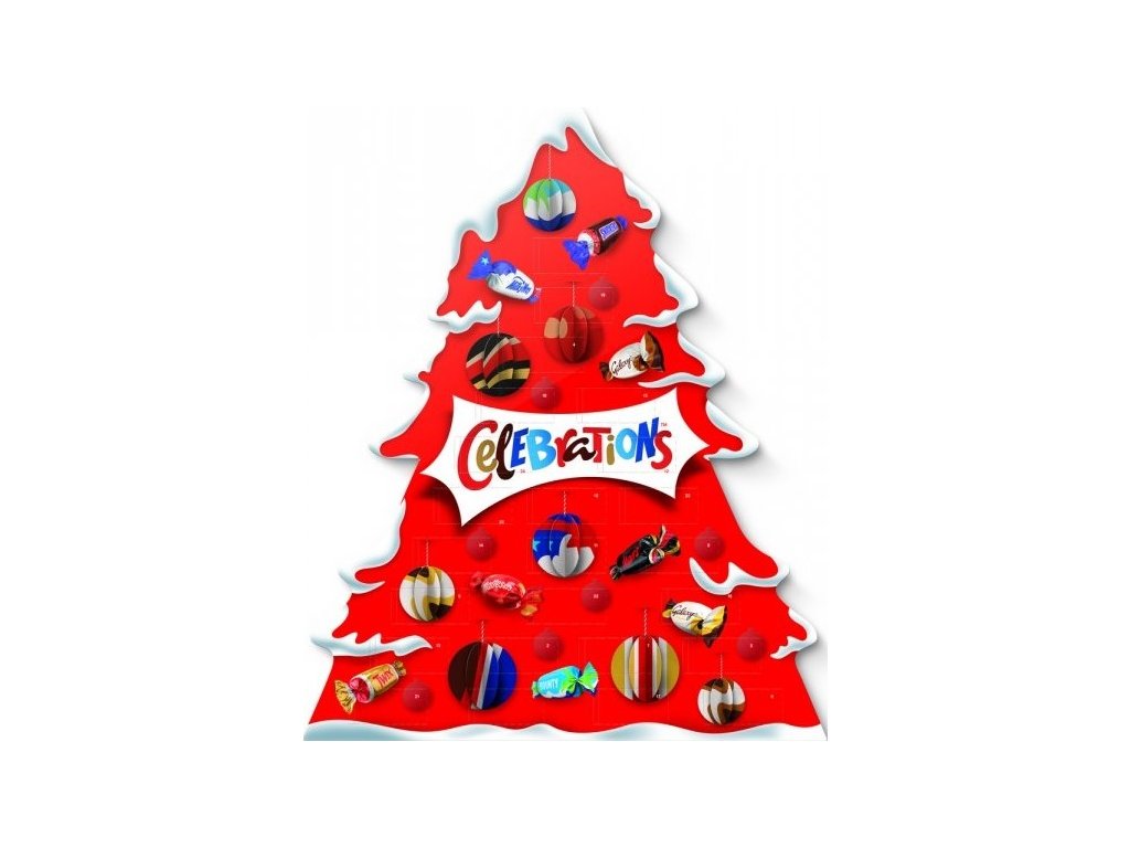 Celebrations advent calendar in the shape of a red tree.